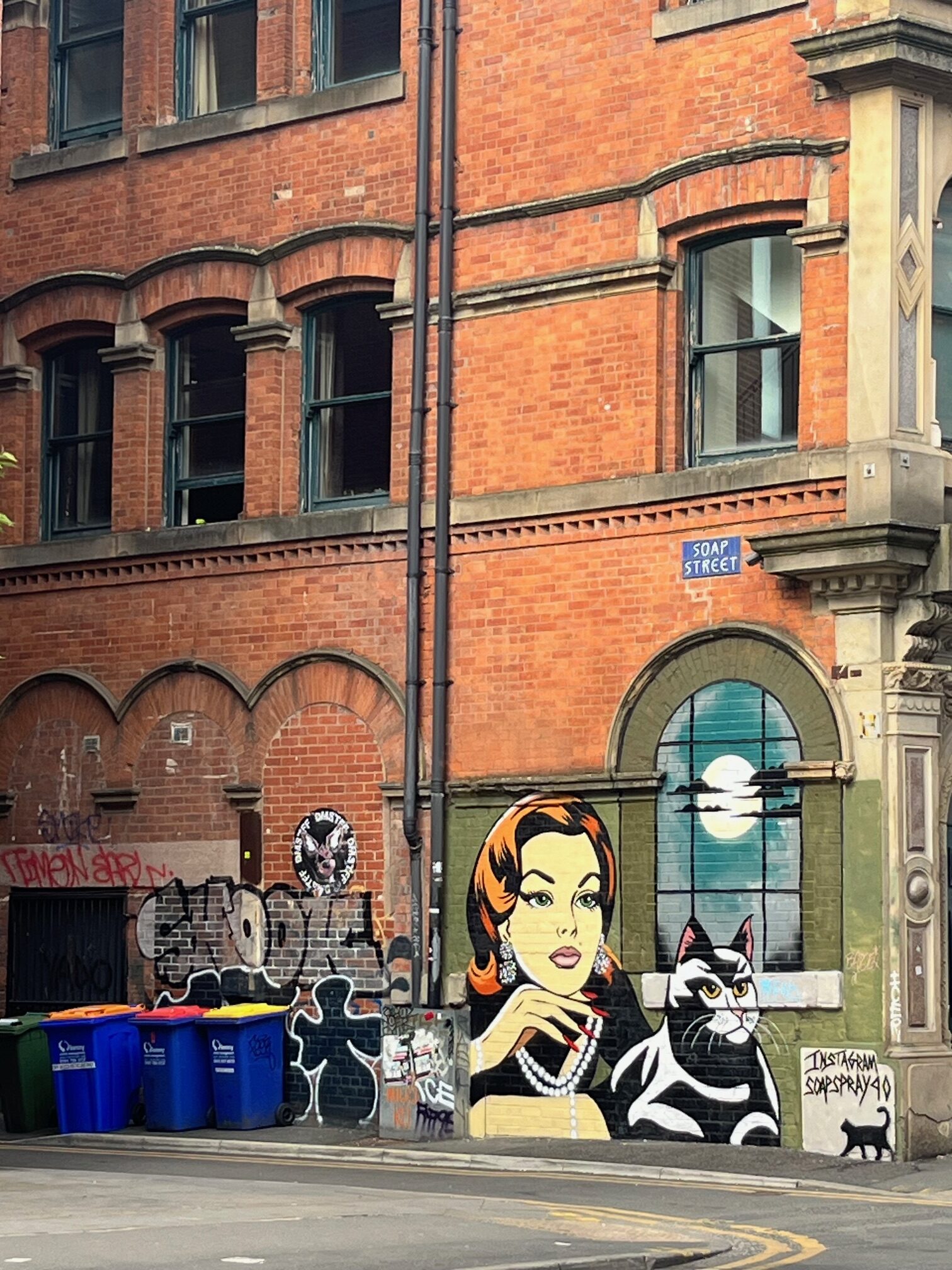 Manchesterin keskustasta, hotellin läheltä löytyi tämä muraali. Kahviloita ja kaiken maailman ruokapaikkoja löytyi ihan samasta korttelista hotellin kanssa.